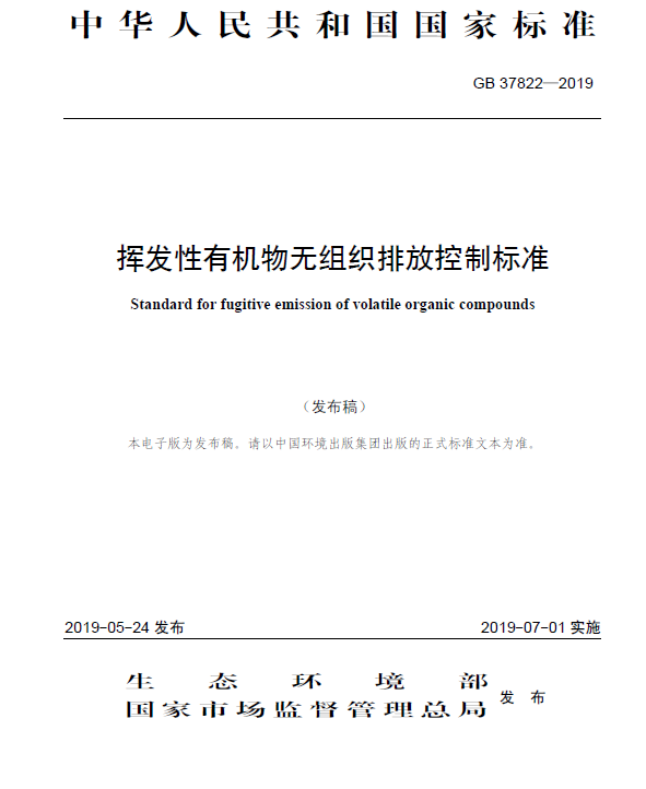 为贯彻《环境保护法》《大气污染防治法》,防止环境污染,改善环境质量,加强对VOCs无组织排放的控制和管理,生态环境部、国家市场监督管理总局联合发布《挥发性有机物无组织排放控制标准》,标准号为GB 37822-2019。