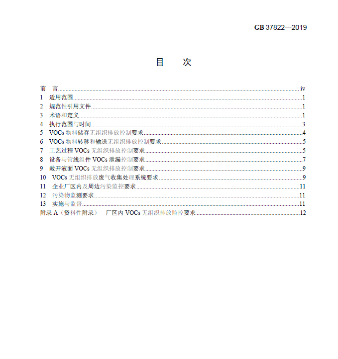 该标准规定了 VOCs 物料储存、VOCs 物料转移和输送、工艺过程、敞开液面等的 VOCs 无组织排放控制要求,设备与管线组件 VOCs 泄漏控制要求,以及 VOCs 无组织排放废气收集处理系统要求、企业厂区内及周边污染监控要求。